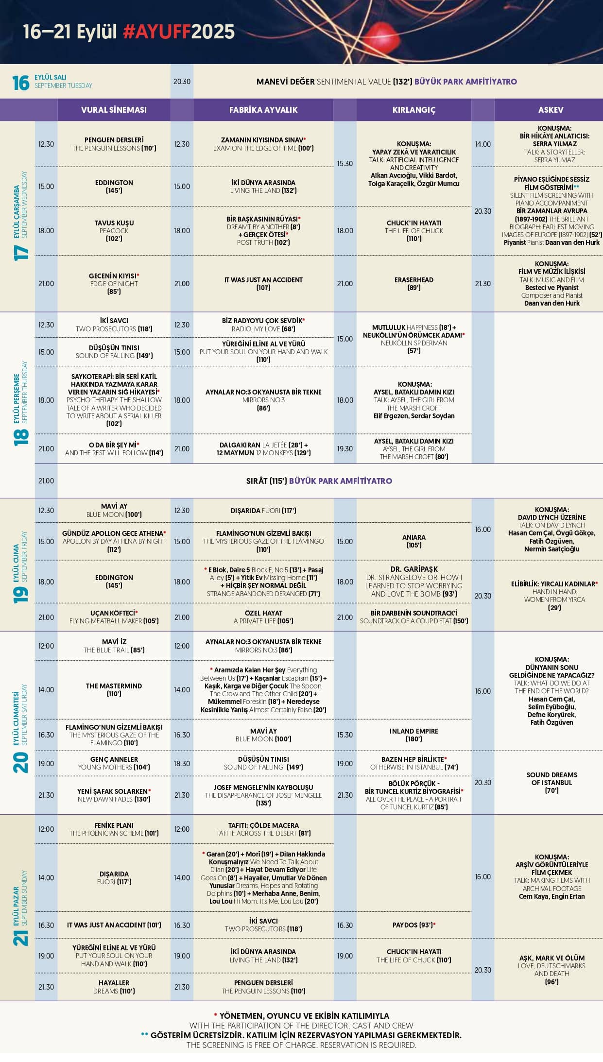 Festival boyunca gerçekleşecek yan etkinlikler, yönetmen ve oyuncu söyleşileri, film atölyeleri ve paneller, yalnızca sinemaseverlere değil, Ayvalık’ta yaşayan herkese hitap edecek. Böylece festival, sanatın evrensel dilini Ayvalık’ın tarihi ve doğal güzellikleriyle buluşturarak unutulmaz bir deneyim sunacak.