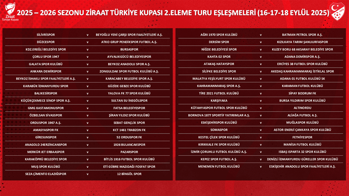 Ziraat Türkiye Kupası 2. Eleme Turu, hem alt liglerden gelen takımların vitrine çıkma fırsatı bulduğu hem de futbolseverlerin sürpriz sonuçlara tanıklık ettiği aşamalardan biri olarak öne çıkıyor.